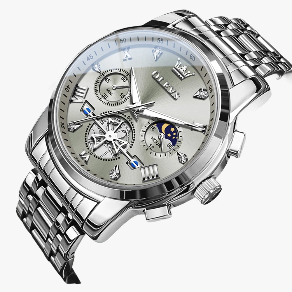 Elegant Men’s Chronograph Wristwatch with Roman Numerals and Moon Phase
